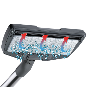 Über die Düse wird Wasser fein dosiert auf ein Reinigungsvlies aufgebracht. Mit dem befeuchteten Vlies wird dann Schmutz und Staub schonend von der Oberfläche entfernt. Die Restfeuchtigkeit wird kraftvoll aufgesaugt und landet – wie auch Staub und Schmutzpartikel – in der AQUA-Filterbox und wird dort zuverlässig in Wasser gebunden.